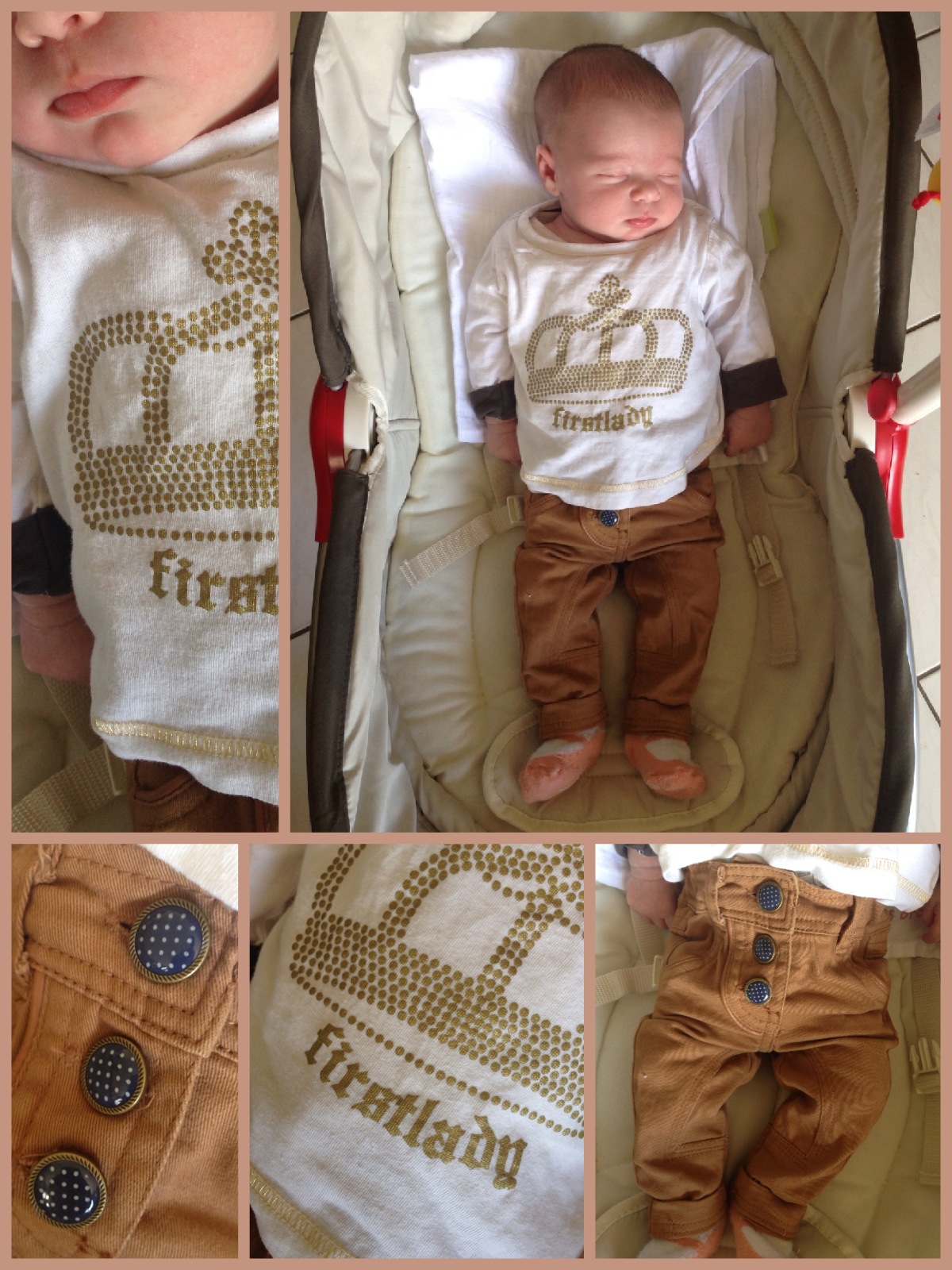 L’été est enfin là ! (bon ok pas sur les 2 premières tenues lol), ma puce met encore du 1 mois et j’avais surtout du chaud :S alors vendredi dernier c’était solde pour Mlle pour lui trouver des tenues été en 1 mois ^^