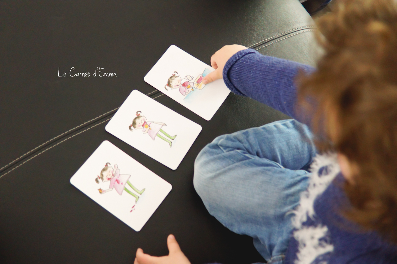 On commence avec les séries de 3 cartes qu’il faut replacer dans l’ordre puis décrire.