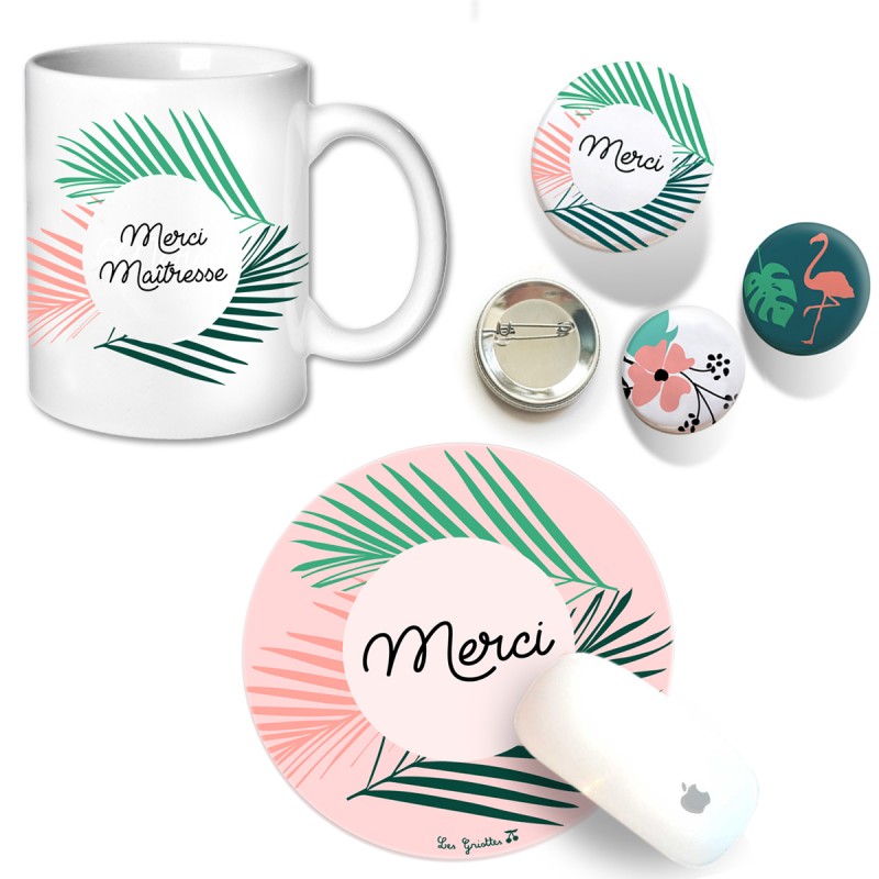 J’ai choisi le kit avec le mug, la trousse et les badges. Il existe une version avec un tapis de souris à la place de la trousse, mais aussi chaque pièce en individuelle. Et si vous n’êtes pas fan de ce motif jungle il existe 2 autres motifs (éventail et fleurs)