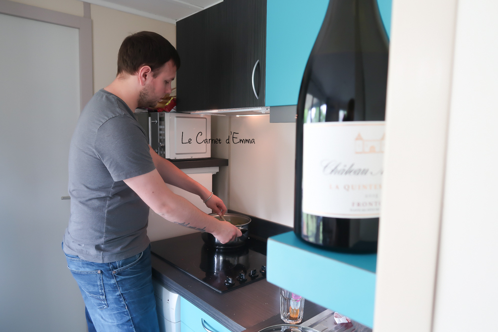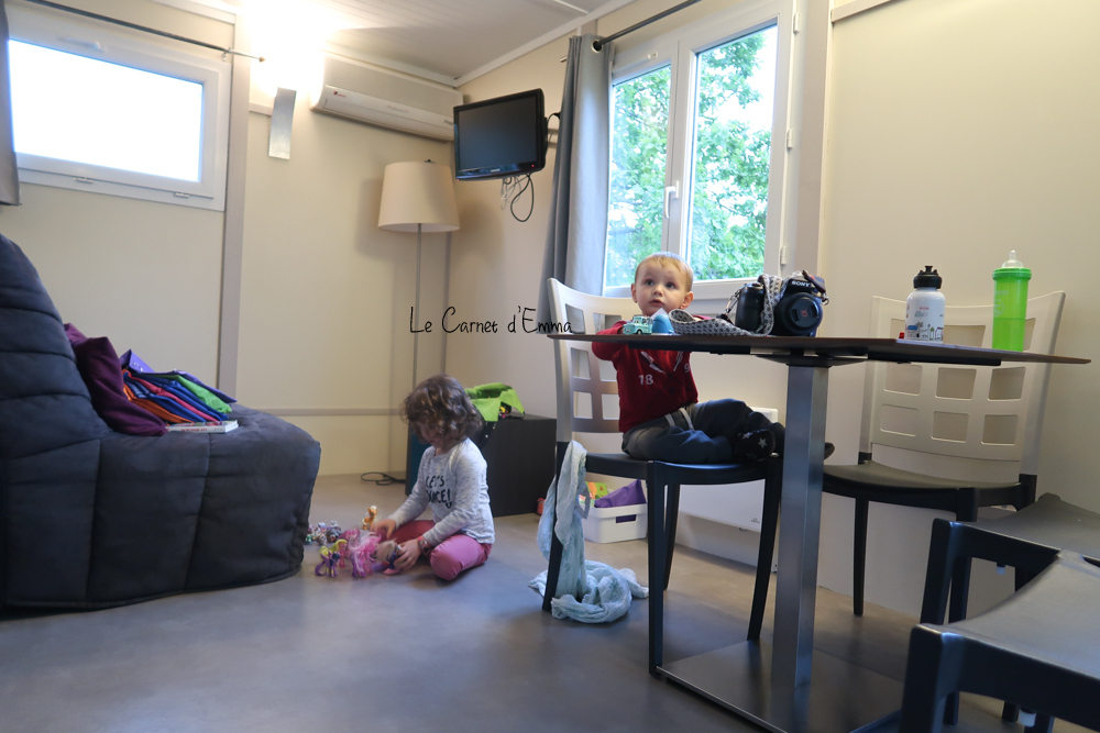 Nous étions dans un chalet « Aquitaine« . Un chalet de 38m² ayant 2 chambres (un lit double et deux lits simples) 2 salles de bains avec douche et wc. Tout ce qu’il faut pour passer une semaine conviviale sans trop se marcher dessus. La cuisine est fonctionnelle avec un petit lave vaisselle (très important lol). Nous avons eu également à disposition un lit bébé et une chaise haute. Plus qu’appréciable avec un enfant en bas âge. Ce qui permet de gagner de la place dans le coffre de la voiture.
