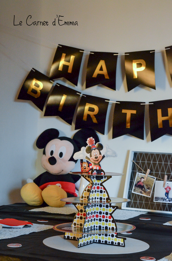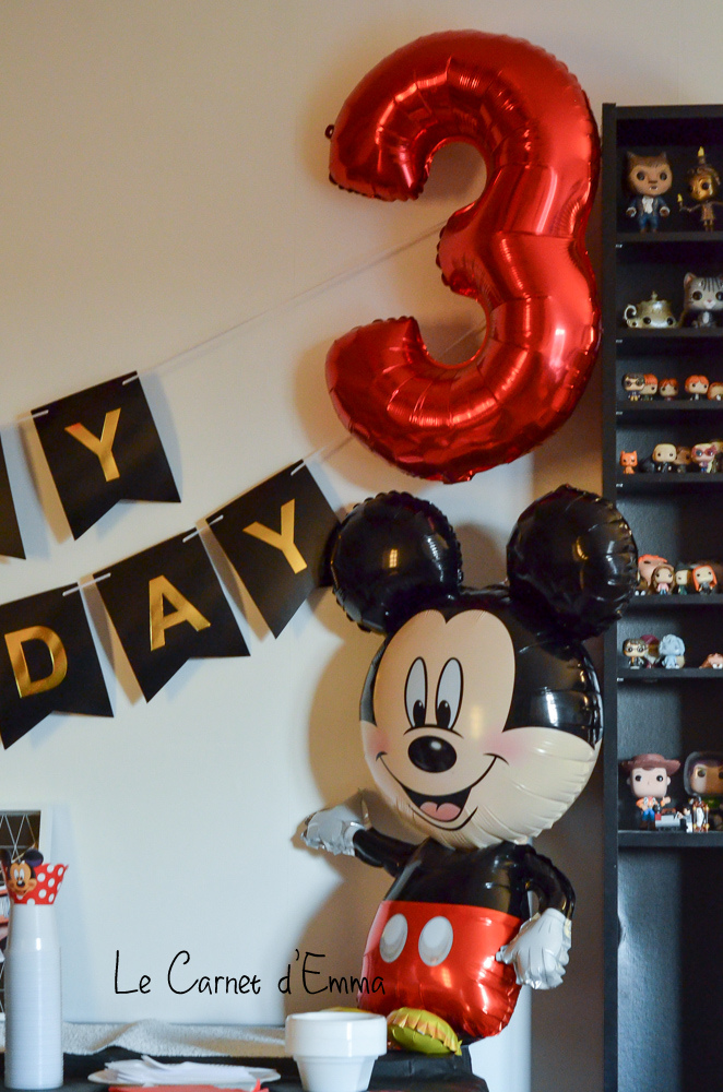 Voici quelques photos de la déco. J’ai prit sur aliexpress les ballons, la guirlande Happy Birthday, le ballon mickey, la nappe, le support à cup cake. La peluche Mickey, je l’avais reçu dans un colis de la part de Doddie il y a 2 ans. 15 jours avant l’anniversaire, Kris s’était amusé à le maquiller. Lui qui ne s’en souciait pas jusque là grrr. Je l’ai frotté avec le savon magique des tendances d’Emma puis un coup en machine lavage délicat et il était redevenu tout beau. Ouff.
