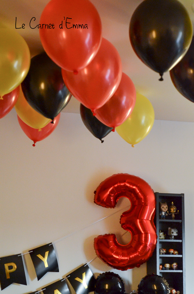On a prit le temps, on l’a fêté 2 mois plus tard pour que la famille puisse venir nous voir. On voulait pouvoir faire cette journée tous ensemble. J’ai eu du mal à trouver un thème qui pouvait plaire à mon petit fan de McQueen, je l’ai fait choisir entre 2 idées : Mickey et Woody. Il a choisi Mickey. En cherchant sur pinterest des idées de déco, j’ai trouvé ces 3 couleurs autour de mickey : le rouge, le noir et le jaune. Les couleurs de Mickey tout simplement. J’ai fouillé sur aliexpress (comme à chaque fois que je cherche de la déco à petits prix), j’ai commandé seulement 1 mois avant la date de l’anniversaire. Je vous assure que j’ai serré les fesses pour tout recevoir à temps surtout les tenues des enfants.