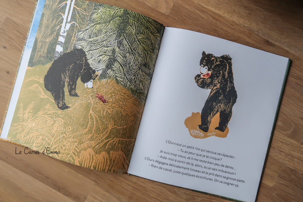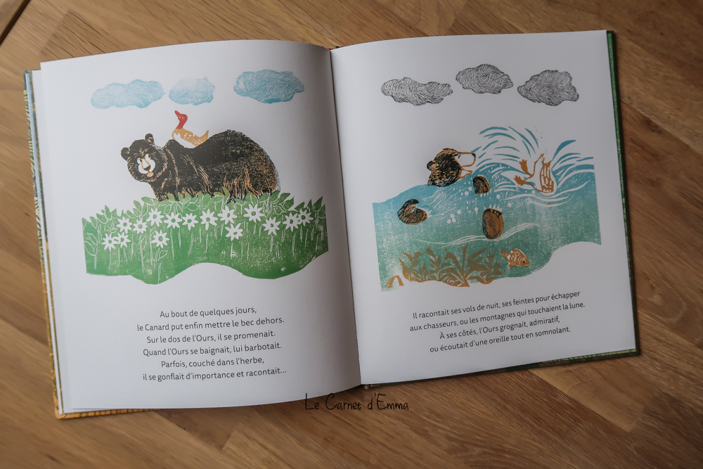 Une nouvelle maison d’édition qu’on découvre avec ce livre tout en poésie : l’ours et le canard. L’histoire ? Un ours qui prend sous sa protection et soigne un canard blessé. Au fil des mois et des saisons une amitié se crée entre ces deux animaux normalement hostiles et très différents. Une belle leçon de tolérance, qui montre à nos enfants qu’on peut être différents mais amis. J’ai beaucoup aimé ce livre avec ces jolis dessins et ses textes facilent à lire et à comprendre pour les enfants.