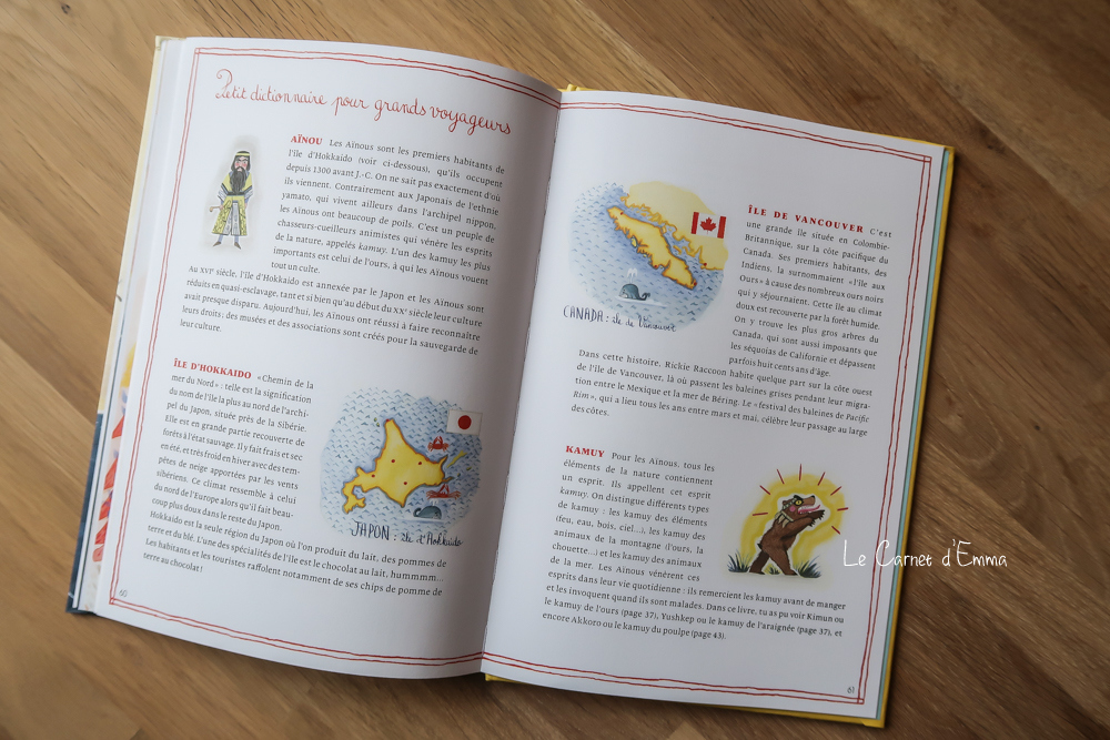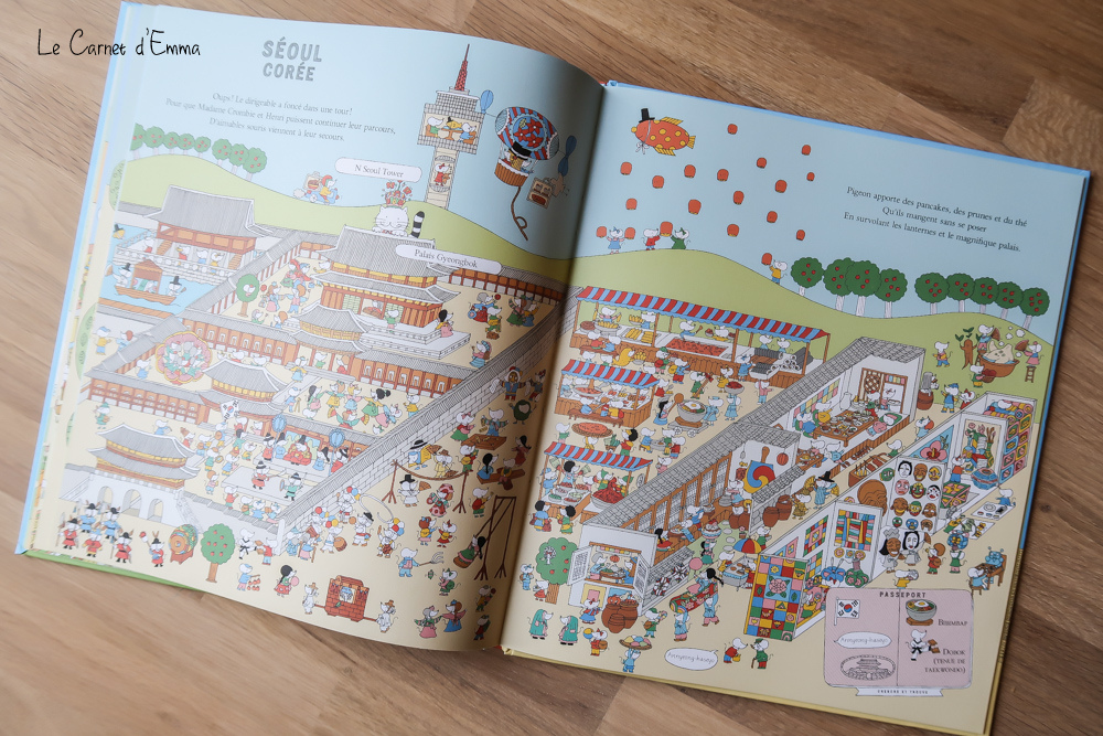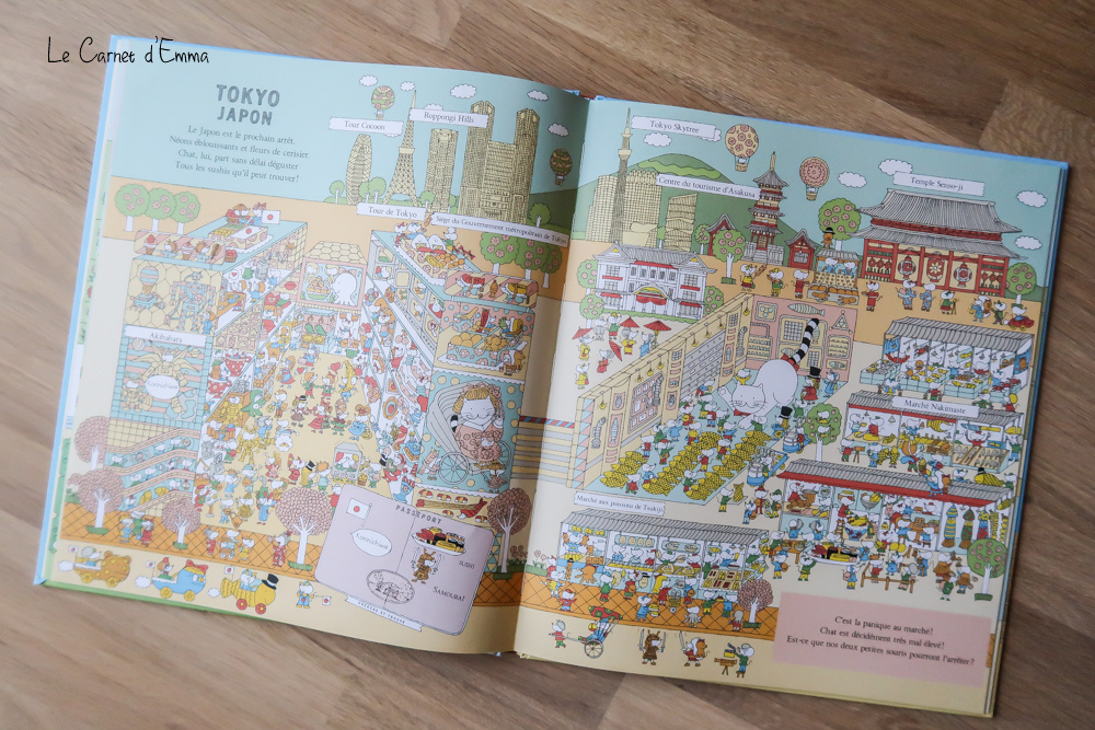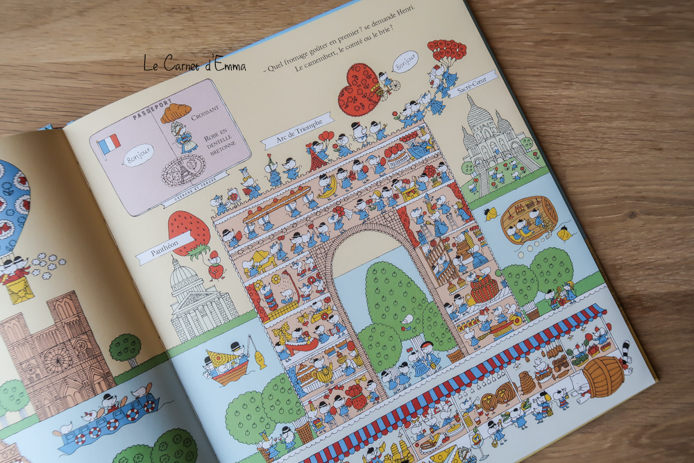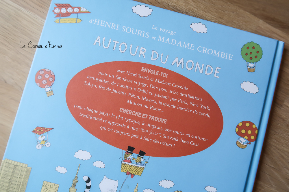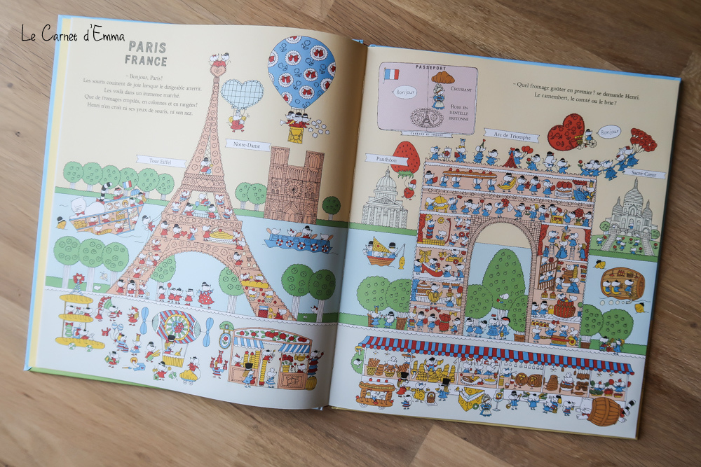 Un grand livre avec des illustrations superbes et détaillés. Un cherche et trouve tout en racontant une histoire. Au fil des pages on suit le tour du monde d’Henri Souris, il visite 16 destinanations :Paris, Tokyo, Delhi, Mexico, Pekin .. Dans chaque pays l’enfant doit trouver le plat typique, le drapeau, une souris en costume traditionnel et apprends à dire bonjour. Sans oublier qu’on peut chercher aussi Mme Crombie et Mr Souris ainsi que le chat qui les accompagne et leur mongolfière. Sur chaque page les monuments célèbrent sont présentés avec une étiquette à leur nom. On peut passer de longues minutes sur chaque page à regarder, chercher les différents détails. Un livre que Katel adore !