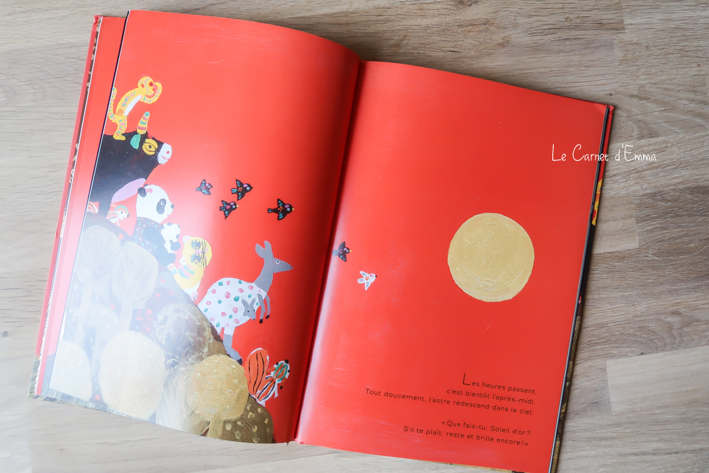 A travers les pages de ce livre on y découvre la course du soleil vue par les animaux, qui se réjouissent de son arrivée le matin, l’appellent dès qu’il est caché par les nuages et tentent par tous les moyens de le retenir de se coucher le soir. Heureusement, il revient tous les matins ! Une jolie façon d’aborder le déroulement de la journée avec les enfants et les rassurer s’ils ont peur de la nuit. Oui le jour revient chaque matin pour profiter d’une nouvelle journée ensemble. Un livre vraiment beau avec un effet de dorure dans les illustrations.