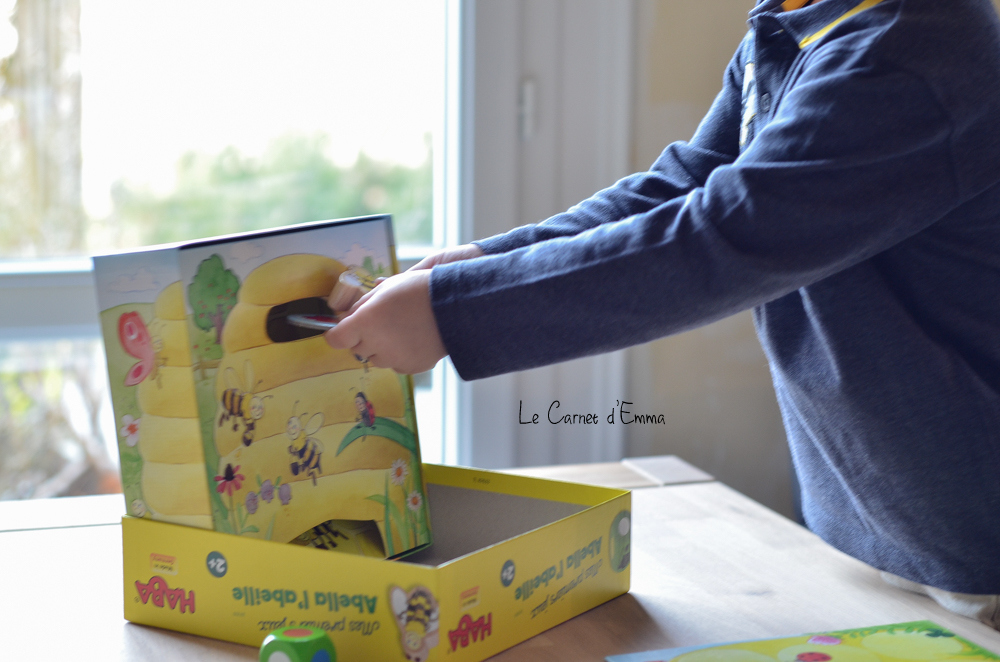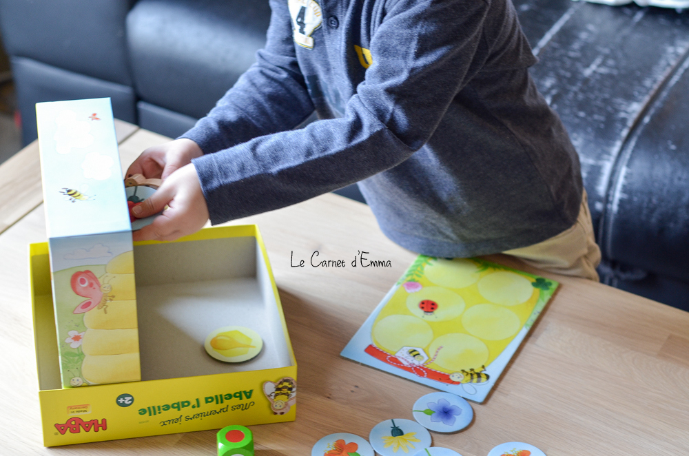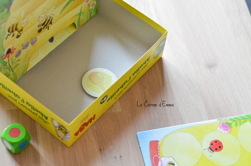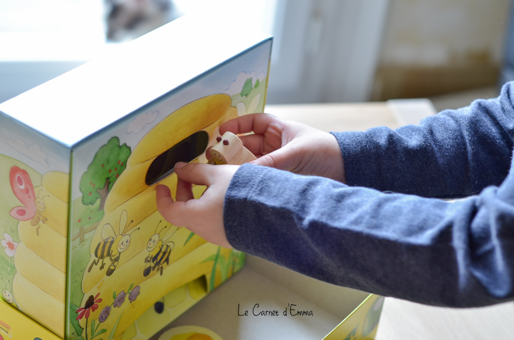 Cette fois-ci on va aider Abella l’abeille à récolter du miel ! Les jeux haba ont un univers, des visuels et des supports ultra travaillés et qui donnent envie de jouer. On peut très facilement entrer dans l’imaginaire et le jeux. Un vrai point fort pour moi. Ici la boîte se transforme en ruche et lorsque vous glisser une fleur dans la ruche, il ressort une goutte de miel. Même moi je suis à fond ! Comme pour le premier jeu, vous pouvez simplifier ou complexifier les règles.