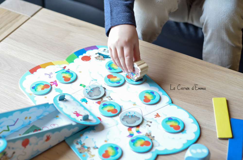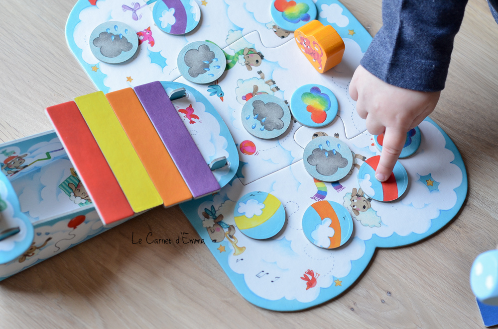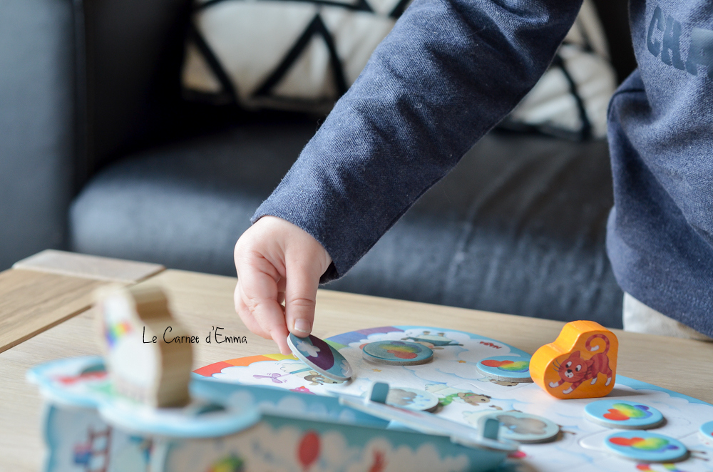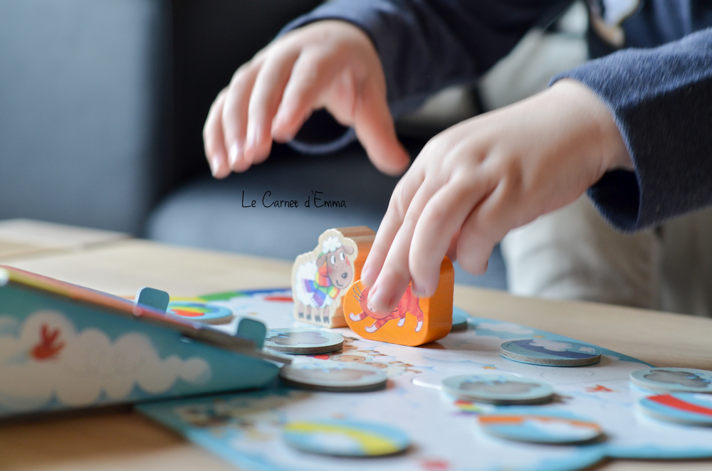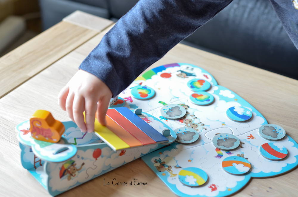 Chez Haba, ce que j’aime c’est l’histoire autour du jeu. Ici l’enfant doit reconstruire l’arc en ciel avec un mouton pour aider le chat qui s’était endormi au sommet, à le rejoindre. Vous pouvez simplifier ou complexifier les règles. On commence toujours le jeu avec tous les nuages face cachée (on voit le nuage arc en ciel) et les pièces de l’arc en ciel à côté du plateau.