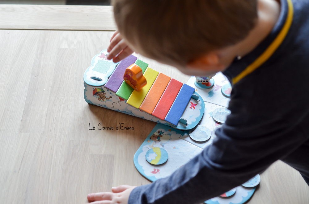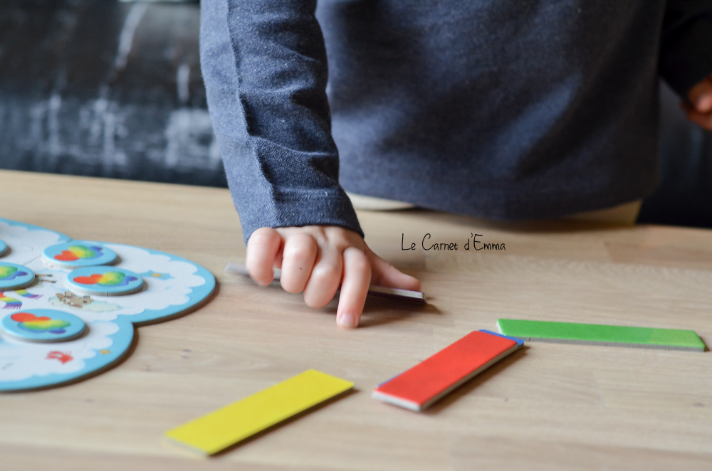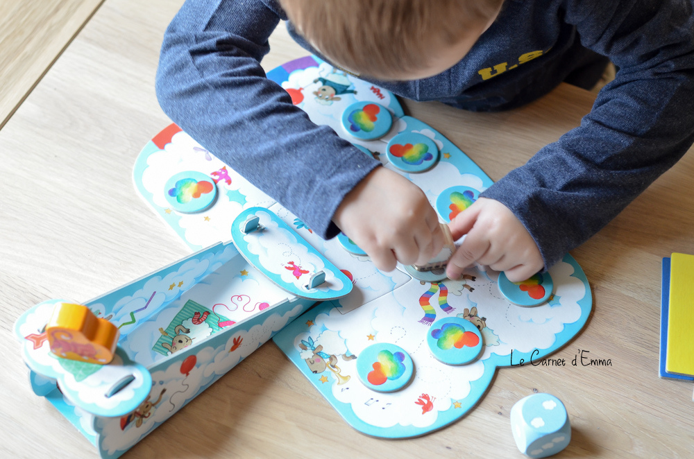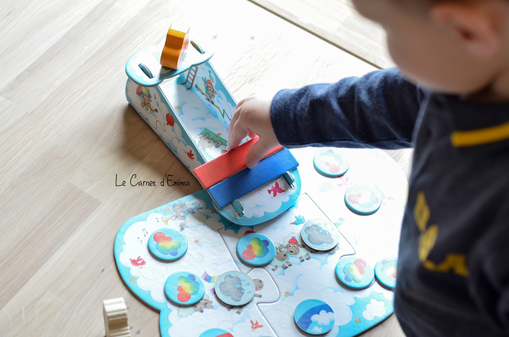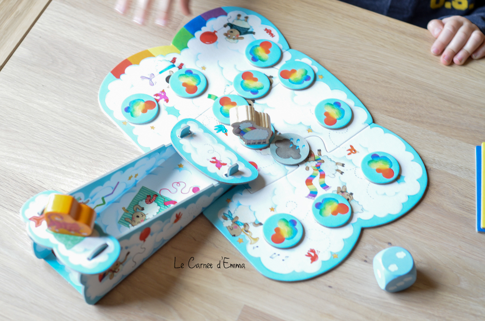 Chez Haba, ce que j’aime c’est l’histoire autour du jeu. Ici l’enfant doit reconstruire l’arc en ciel avec un mouton pour aider le chat qui s’était endormi au sommet, à le rejoindre. Vous pouvez simplifier ou complexifier les règles. On commence toujours le jeu avec tous les nuages face cachée (on voit le nuage arc en ciel) et les pièces de l’arc en ciel à côté du plateau.