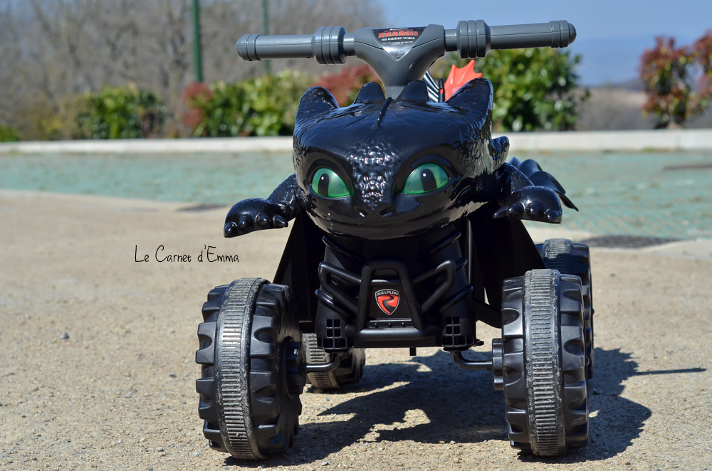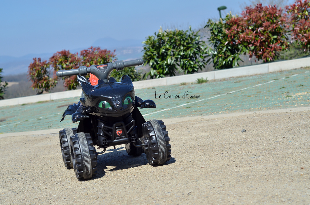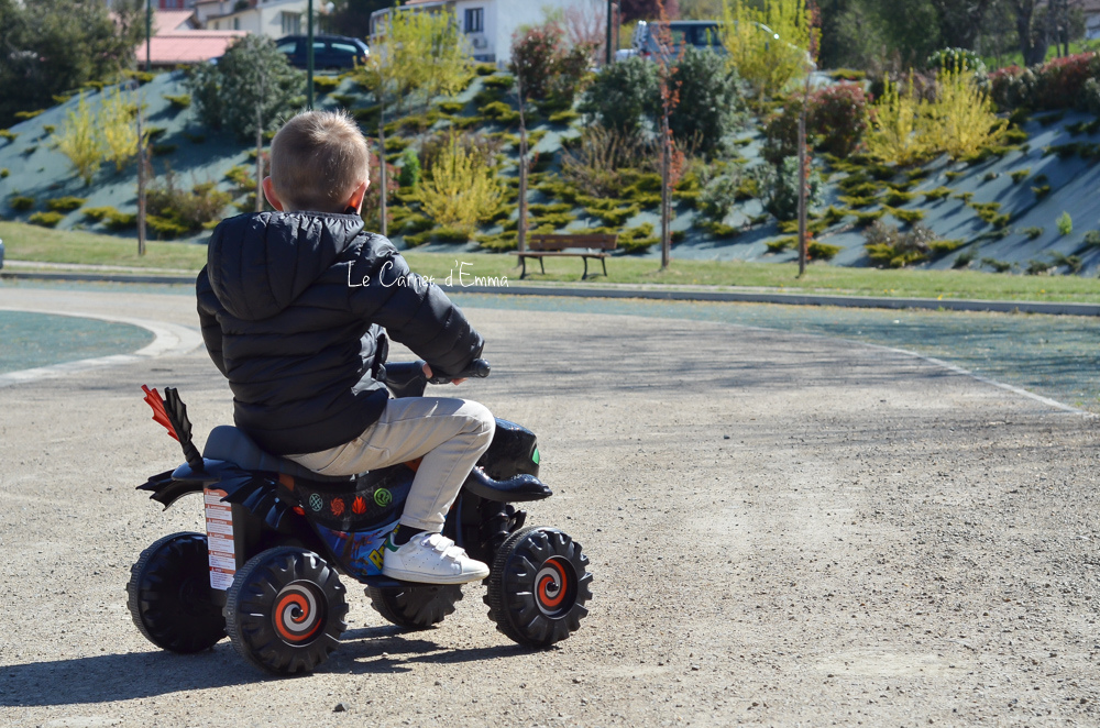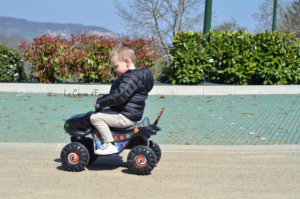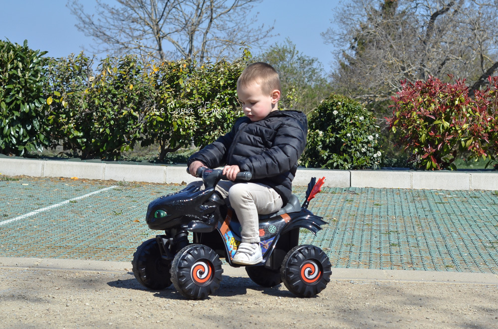 Niveau finition, nous ne sommes pas sur le haut de gamme de la marque mais la qualité est là. Il fait amplement le job et est assez solide pour supporter les assauts d’une tornade comme mon fils. Les roues sont en plastiques et solides. Le démarrage et l’arrêt du quad se fait par simple pression d’un bouton. Pour avance l’enfant doit rester appuyer sur le bouton, dès qu’il le lâche le quad s’arrête ! Pas de freins à gérer. Il est très stable sans risque de basculer. Le marche pied, qui est bas, a été pensé pour que les enfants puissent monter et descendre sans difficulté dès 2 ans. Concernant son autonomie, elle est d’environ 60min. Et le bonus trop fun, les yeux de Krokmou s’allume à l’aide d’un bouton !