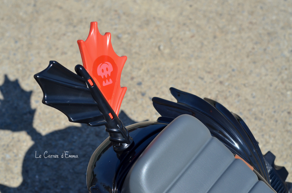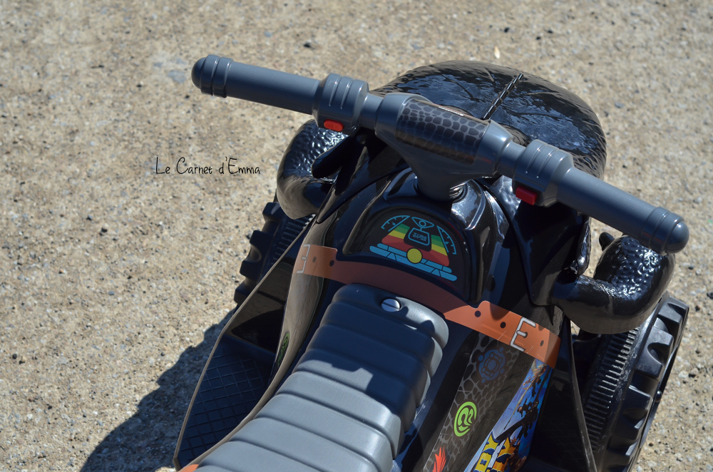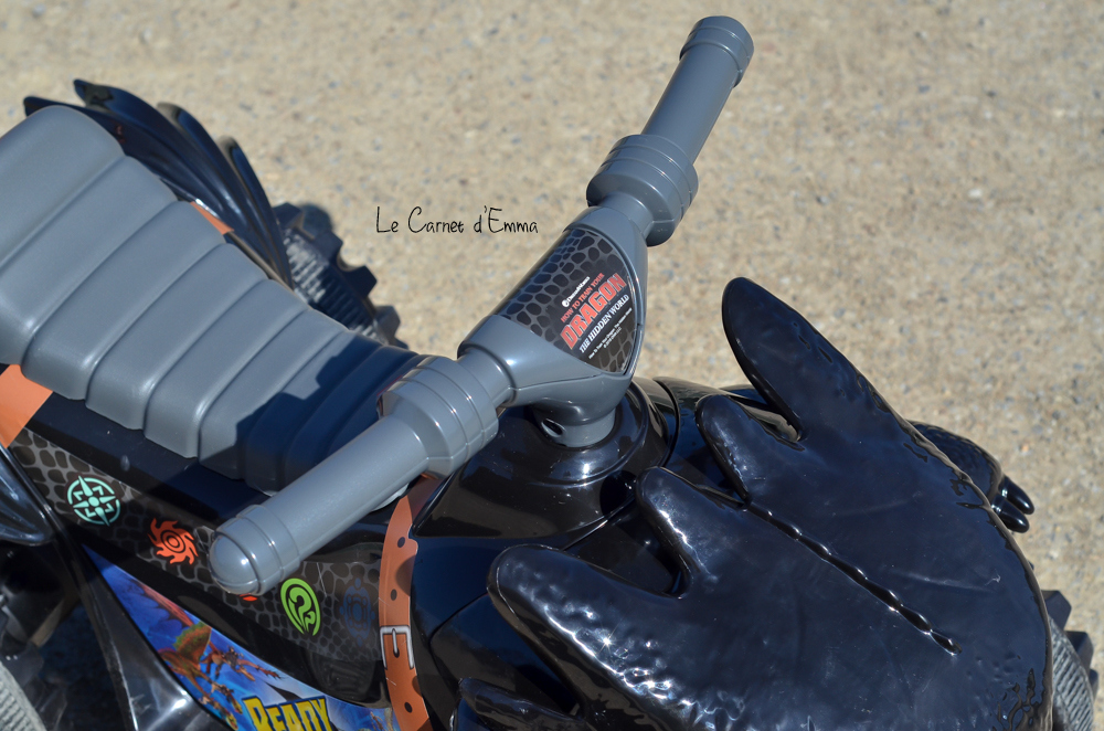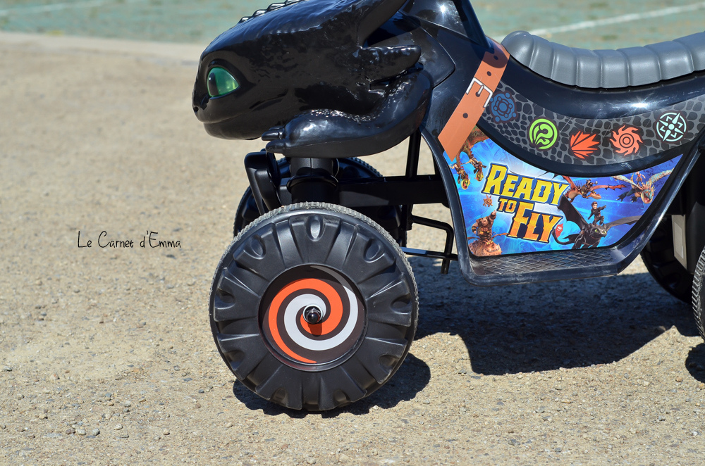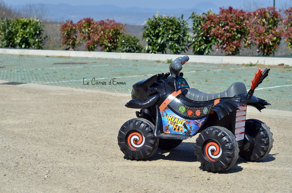 Niveau finition, nous ne sommes pas sur le haut de gamme de la marque mais la qualité est là. Il fait amplement le job et est assez solide pour supporter les assauts d’une tornade comme mon fils. Les roues sont en plastiques et solides. Le démarrage et l’arrêt du quad se fait par simple pression d’un bouton. Pour avance l’enfant doit rester appuyer sur le bouton, dès qu’il le lâche le quad s’arrête ! Pas de freins à gérer. Il est très stable sans risque de basculer. Le marche pied, qui est bas, a été pensé pour que les enfants puissent monter et descendre sans difficulté dès 2 ans. Concernant son autonomie, elle est d’environ 60min. Et le bonus trop fun, les yeux de Krokmou s’allume à l’aide d’un bouton !