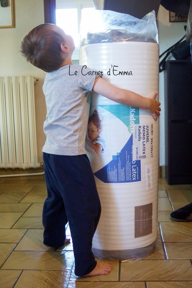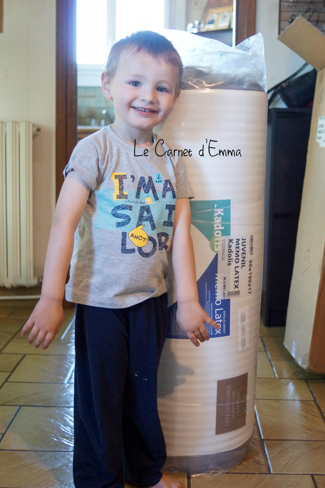 Puis Kadolis m’a proposé de nous envoyer un matelas pour lui, ayant déjà eu un matelas de chez eux pour son lit bébé. Je n’ai pas hésité. Je savais qu’il serait de qualité et qu’il l’accompagnerait longtemps. Après quelques pérépéties de livraison, nous l’avons enfin reçu et Kris était comme un petit fou de savoir que c’était pour lui.
