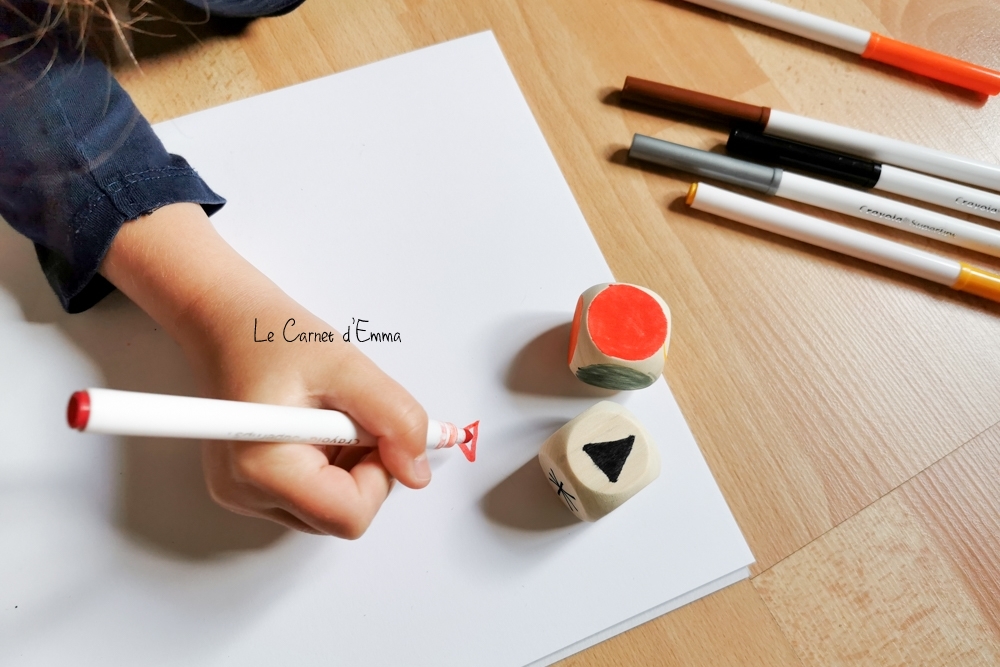 La préparation est finie ! Rien de plus simple à faire. Maintenant que les dés sont prêts, on commence à jouer. L’enfant lance ses dés et va devoir, sur la feuille, reproduire ce que lui est indiqué. Par ex : triangle, rouge, 3. L’enfant doit dessiner 3 triangles rouges. Simple non ? Mais efficace pour leur faire faire du graphisme tout en jouant.