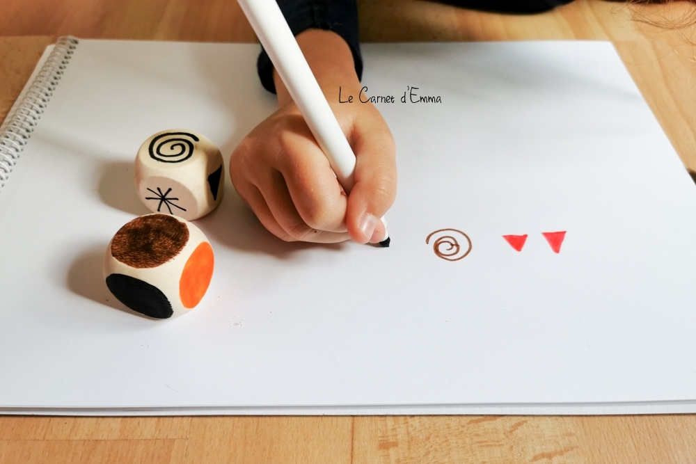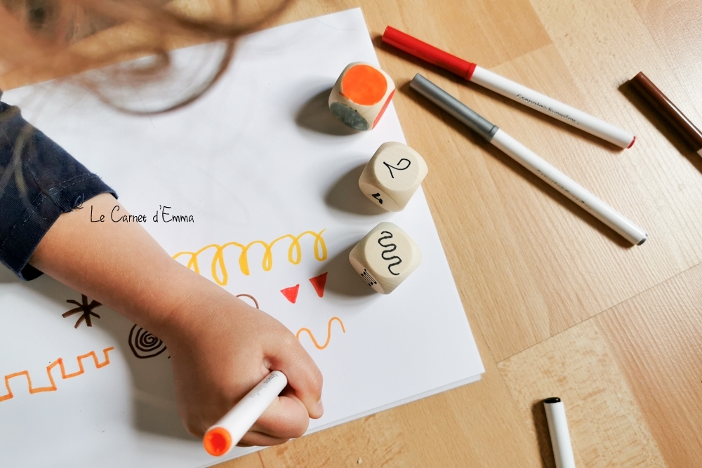 J’ai découvert cette activité sur l’insta Apprendsmoiafaireseul, il y a un petit moment déjà. Je l’avais gardé en tête pour la proposer à Kat et à Kris. Et cet été j’ai acheté les dés pour pouvoir la faire. L’idée de cette activité est très simple. Il suffit à l’enfant de reproduire les graphismes présents sur les dés. Je vous explique en détail.