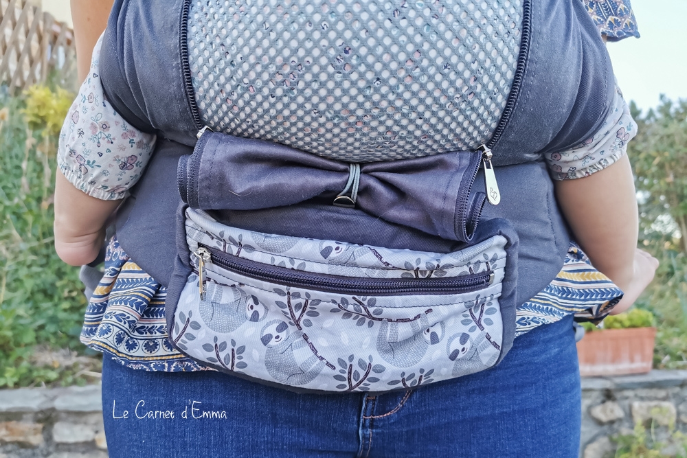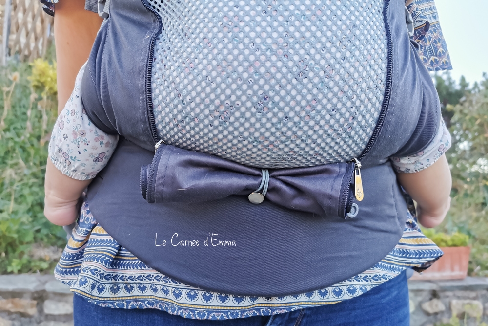 Un de ses points fort pour moi c’est son tablier qui dispose d’un tissu en coton pour l’hiver que l’on peut enrouler sur lui-même afin de dévoiler un tissu mesh aéré en-dessous. On passe ainsi d’un mode hiver à un mode été e, quelques secondes et facilement à l’aide des deux fermetures éclair qui sont sur les côtés du tablier. Pour l’accrocher il y a un bouton. C’est vraiment pratique ! A quoi ça sert ?En aérant ainsi le porte bébé on évite à l’humidité et la transpiration de s’installer.