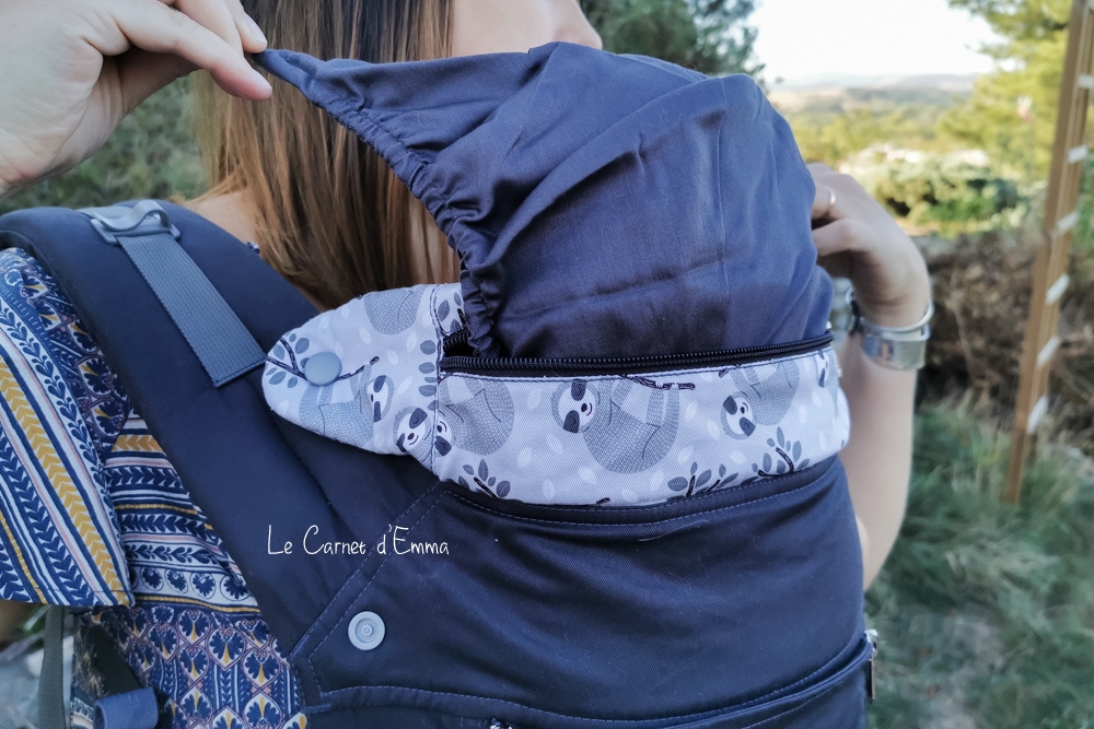 La ceinture et les bretelles sont rembourrées pour plus de confort. On peut mettre les bretelles en position X ou en H. Ainsi vous pouvez adapté votre confort et répartir le poids sur votre dos. Il y a du monde qui aime croisé d’autres non, avec ce porte bébé vous avez le choix. Les bretelles sont pourvus de boutons pressions pour accrocher la sangle de cou. Ainsi la sangle ne fait pas rouler les bretelles qui restent bien à plat assurant du confort supplémentaire pour le porteur. Il y a également des petits crochets placés sur des sangles coulissantes pour régler la capuche et la maintenir. Cette dernière est anti-uv, imperméable et réglable sur-mesure. Sans oublier qu’elle se range et se sort facilement. Et ça c’est important. Le nombre de fois que j’ai pu m’énerver sur des capuches inrangeables lol.