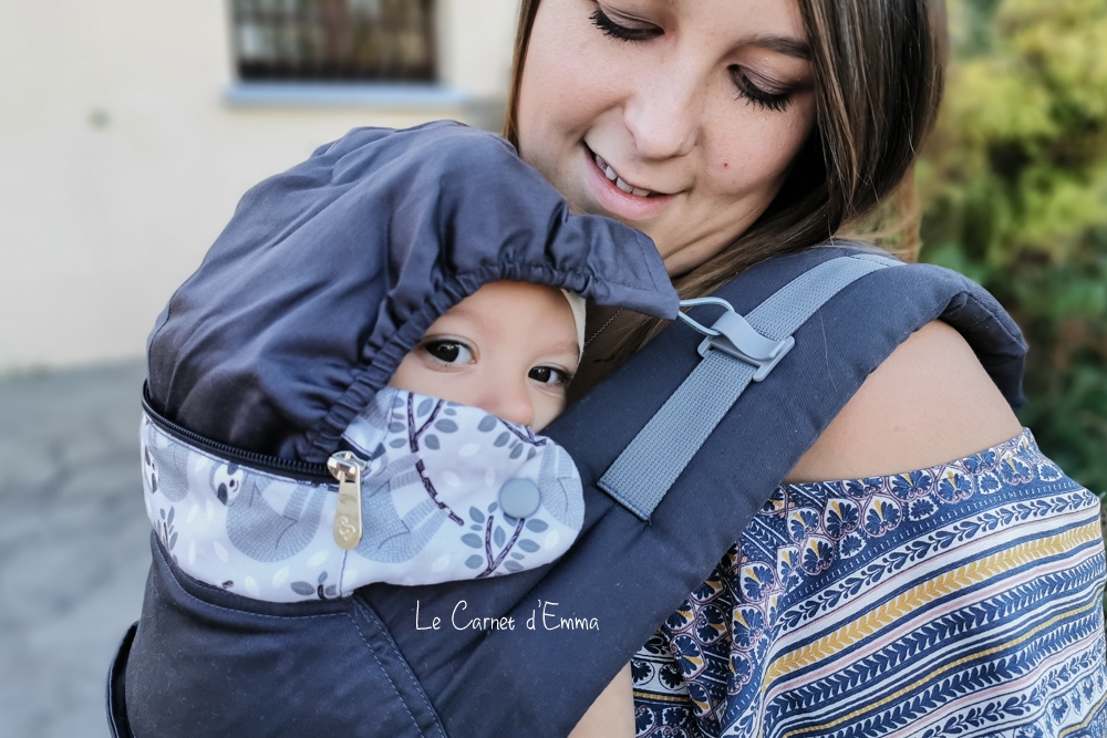 Il est ajustable en hauteur (avec la capuche, je vous montre en détail plus bas) et en largeur à l’aide de scratch que l’on peut régler très précisement en fonction de bébé.