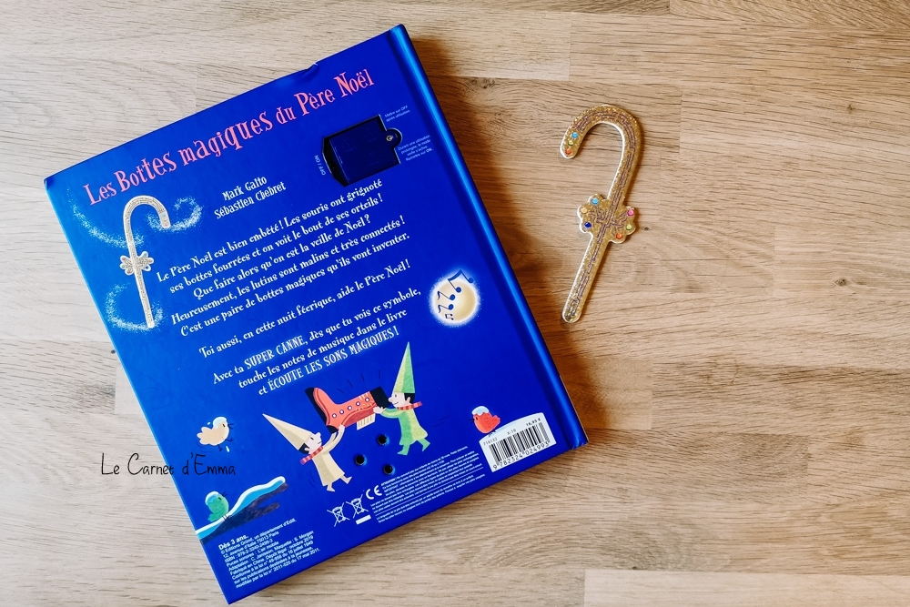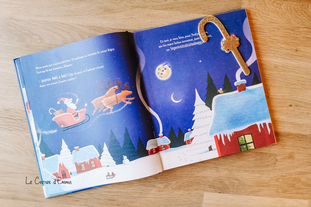 Un de mes préférés je crois bien. Dans ce livre on suit le Père Noël dans sa tournée de cadeaux, mais il a reçu avant de partir un cadeau des lutins : des bottes magiques avec une canne. Lorsqu’il tape avec cette dernière sur ces bottes en disant une formule magique, ces bottes viennent à son aide. Mais la grande particularité de ce livre, c’est que l’enfant peut vraiment utiliser la canne pour faire dire la formule au Père Noël. Un livre intéractif et sonore unique. J’aime tellement le principe et l’idée de ce livre. Je suis autant à fond que les enfants quand on le lit.